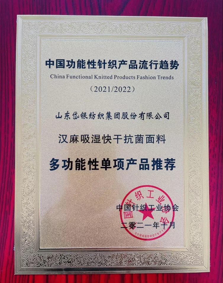 近日,由中國針織工業(yè)協(xié)會和中國國際貿(mào)易促進(jìn)委員會紡織行業(yè)分會舉辦的中國功能性針織產(chǎn)品流行趨勢發(fā)布活動于國家會展中心(上海)圓滿落下帷幕。岱銀紡織服裝研究院參評的漢麻吸濕快干抗菌面料”獲得中國功能性針織產(chǎn)品流行趨勢多功能性單項產(chǎn)品推薦。